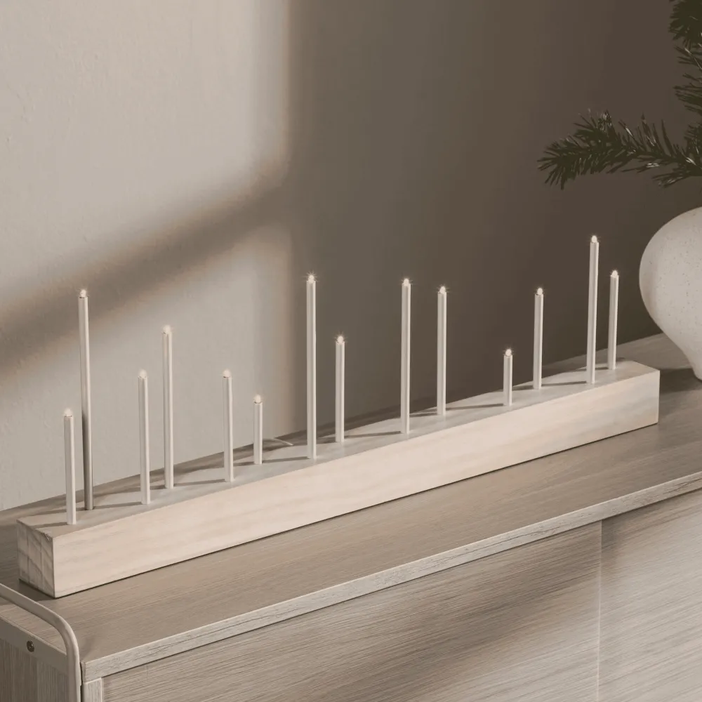 Het witgekalkte MDF ontwerp geeft een subtiel en tijdloos gevoel aan je inrichting en creëert tegelijkertijd een rustgevende sfeer in je huis. Zet hem op je eettafel, op een plank of als centraal onderdeel van je kerstdecoratie om je huis tijdens de feestdagen te verlichten.