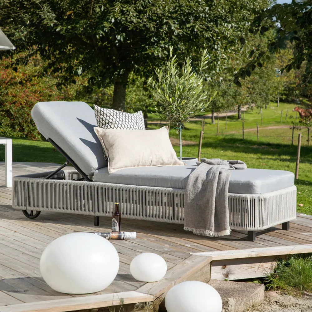Een klassiek ligbed van grijze touwen met bijbehorende kussens. Plaats hem precies waar je wilt en verplaats hem gemakkelijk met het wieltje. Geniet hier van op een warme zomerdag in de zon!