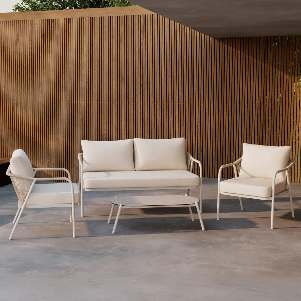 Aleyna is een elegante meubelset die je terras een verfijnde en uitnodigende uitstraling geeft. De set bestaat uit een tafel met een strak glazen blad, twee comfortabele fauteuils en een bank – allemaal gemaakt van lichtgewicht en duurzaam aluminium dat bestand is tegen weer en wind.