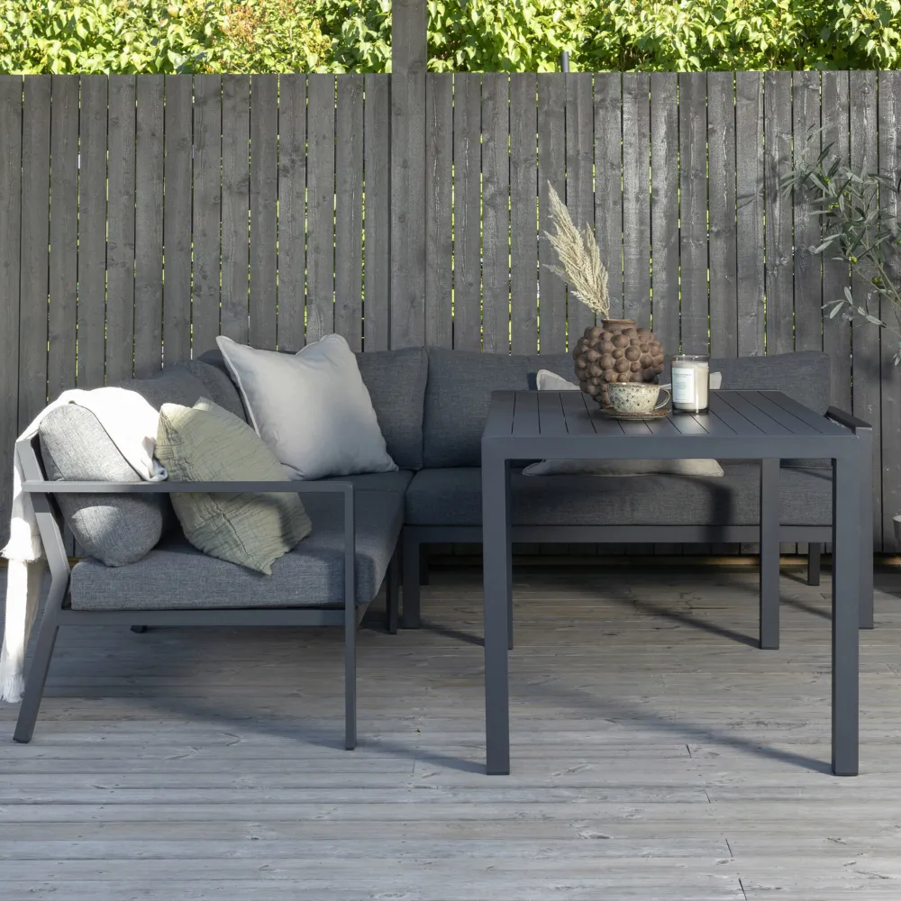 De hoekgroep van Ramo is geweldig voor wie veel rondhangt en een groter terras of patio heeft! Met zijn tijdloze ontwerp en duurzame materialen is het een meubelstuk dat vele jaren meegaat. Perfect voor een kopje koffie of waarom niet een boek lezen in de zon? Het frame is van zwart gelakt aluminium met kussens in grijs.