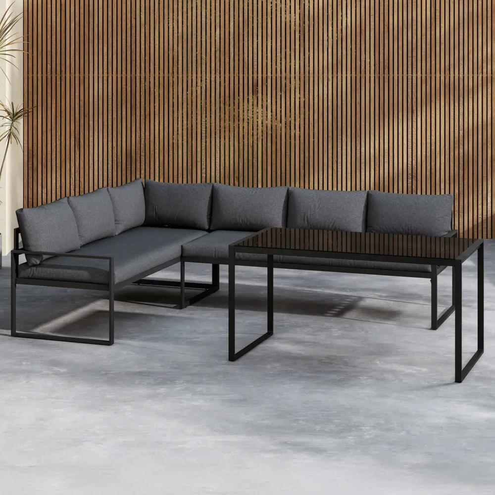 Jenalee is het bankstel dat elegantie en functionaliteit combineert voor je terras. Met een strak zwart frame en grijze kussens van duurzaam polyester creëert Jenalee een moderne en uitnodigende sfeer. De hoekbank biedt voldoende ruimte voor het hele gezin om samen te komen en te genieten van gezellige momenten, of het nu gaat om een heerlijke avond of een ontspannen dag buiten.
