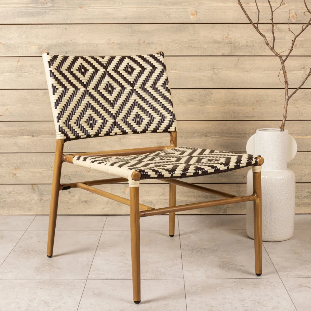 Een loungestoel die indruk maakt met zijn moderne ontwerp! De Cherrise is even strak als trendy met zijn decoratieve rugleuning en zitting van gedessineerd kunstrotan in beige en bruine kleuren en frame van naturelkleurig aluminium. Plaats hem solitair als stijlicoon of samen met de lounge groep en je krijgt een luxe blikvanger in de serre!