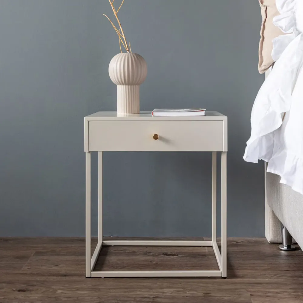 Met een toffe mix van tijdloos design en Scandinavische inspiratie verandert dit stijlvolle beige nachtkastje je slaapkamer in een plek waar stijl en orde samenkomen. Het nachtkastje heeft een handige lade voor verborgen opbergruimte, versierd met een mooie messingkleurige knop die het geheel helemaal afmaakt. Bewaar je avondboek, bril of kleine schatten handig binnen handbereik.