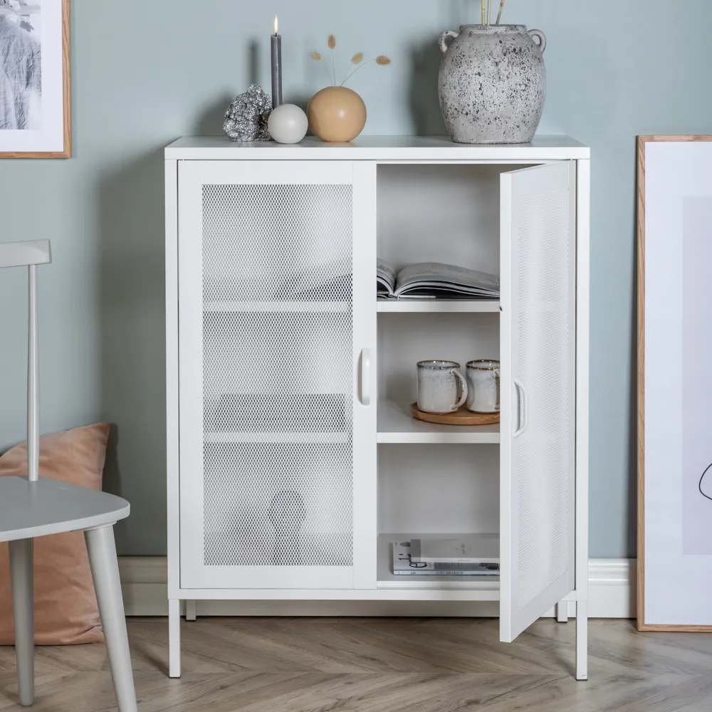 Carmilla, met een gedurfd industrieel ontwerp met stijlvolle gaasdeuren en poten van wit gepoedercoat staal, bevat 2 slimme planken voor handige opslag. De kast wordt verhoogd door slanke, hoge poten die hem een luchtig gevoel geven en het stofzuigen eronder gemakkelijk maken. Het is het perfecte opbergmeubel voor alles wat je nodig hebt – vul het met servies, boeken of mooie decoraties. Dankzij het compacte formaat en de elegante buitenkant is hij gemakkelijk te plaatsen en past hij goed in de meeste kamers in huis – richt hem in volgens jouw behoeften en stijl!