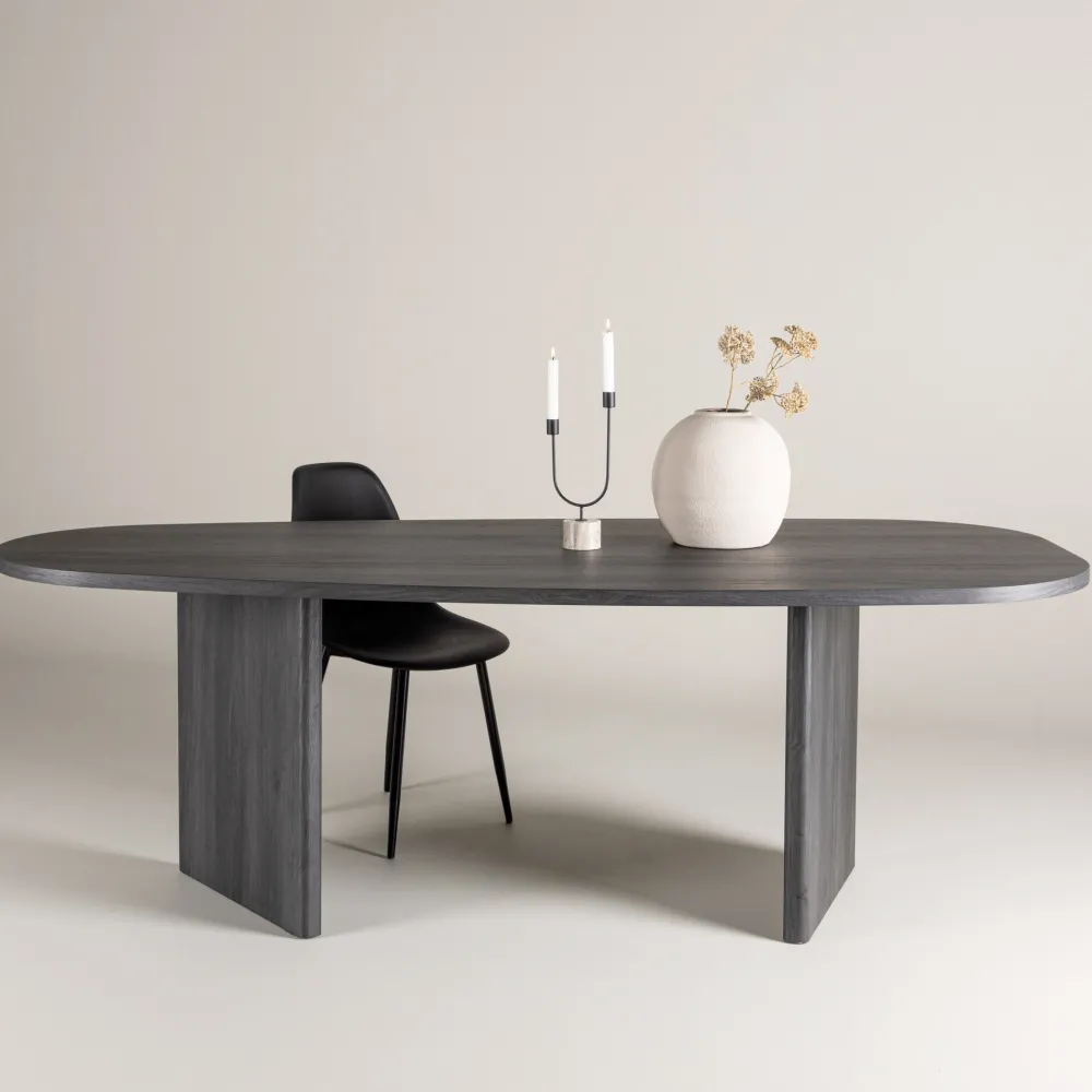De Jenea eettafel is gemaakt van zwart MDF, wat een tijdloze en elegante uitstraling geeft aan je eethoek. Het doordachte ontwerp en de royale afmetingen creëren een uitnodigende sfeer voor elke gelegenheid.