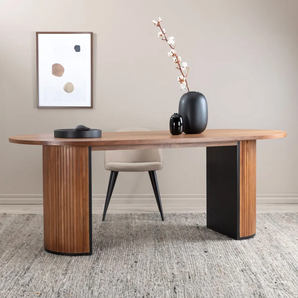 Fionna creëert een stijlvolle blikvanger die indruk maakt! Deze ovale eettafel in de trendy walnootkleur heeft een modern ontwerp met een MDF tafelblad en een robuust frame in geribbeld design dat een stabiele indruk maakt. Verhoog het interieurontwerp in de woonkamer en nodig uit tot vele gezellige maaltijden in het verschiet!