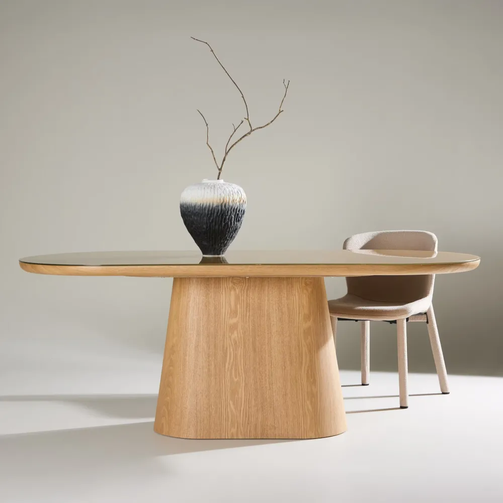 De Nateshia eettafel is de perfecte combinatie van moderne elegantie en tijdloos design. Met een glazen tafelblad en royale afmetingen van 90×200 cm wordt Nateshia een opvallend middelpunt in je eetkamer of keuken, waar vorm en functie prachtig samenkomen. Het transparante glazen tafelblad geeft de ruimte een luchtig en open gevoel, terwijl het licht weerkaatst en een ruimtelijke sfeer creëert. Het glas is zowel stevig als gemakkelijk te onderhouden, waardoor het ideaal is voor dagelijks gebruik en tegelijkertijd een geraffineerd accent toevoegt aan je inrichting. De strakke lijnen en het minimalistische ontwerp van Nateshia zorgen ervoor dat hij gemakkelijk te combineren is met verschillende stijlen en decoraties. Of je nu de voorkeur geeft aan een moderne, industriële look of een meer klassiek en elegant interieur, Nateshia harmonieert moeiteloos en verheft de kamer met zijn strakke esthetiek. Met ruimte voor meerdere gasten is Nateshia de perfecte eettafel voor zowel alledaagse maaltijden als feestelijke gelegenheden. Het ruime oppervlak van de tafel maakt het gemakkelijk om hem op te stellen voor grote diners of om rustig te ontbijten met het gezin. Laat de Nateshia eettafel het hart van je huis worden, waar het glazen tafelblad en de royale afmetingen een elegante en uitnodigende plek creëren voor al je maaltijden en bijeenkomsten.