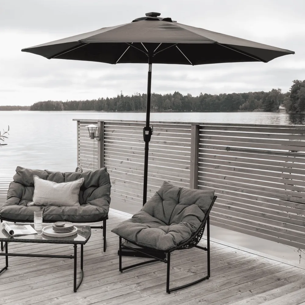 Een vrijstaande parasol met zwarte stof, perfect voor luie dagen in de schaduw! Verplaats hem naar behoefte op je terras. De LED-verlichting geeft ’s avonds een gezellig licht.