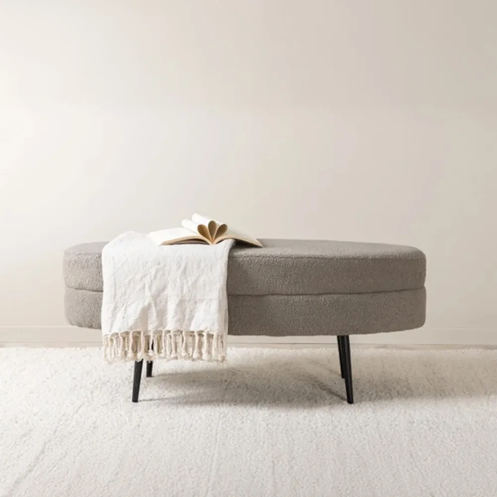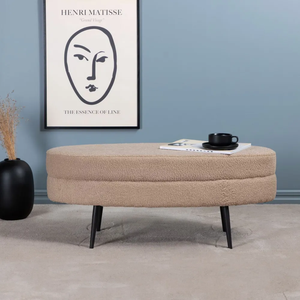 Vernieuw het huis met een mooie beige zitpoef in ovaal design uit de serie Larenzo! Dit trendy interieurdetail werkt geweldig als zowel extra zitplaats, insteloppervlak als comfortabele poef. Met zijn taps toelopende, ovale ontwerp geeft de zitpoef een luxe en gezellig gevoel. Het podium wordt gekenmerkt door een modern ontwerp in zachte beige teddy stof die een warme indruk geeft aan de kamer. Gemaakt van duurzame materialen; schuim, katoenvezel, stof, gebogen hout en staal. Afmetingen: Lengte: 100 cm, breedte: 40 cm, hoogte: 41 cm.