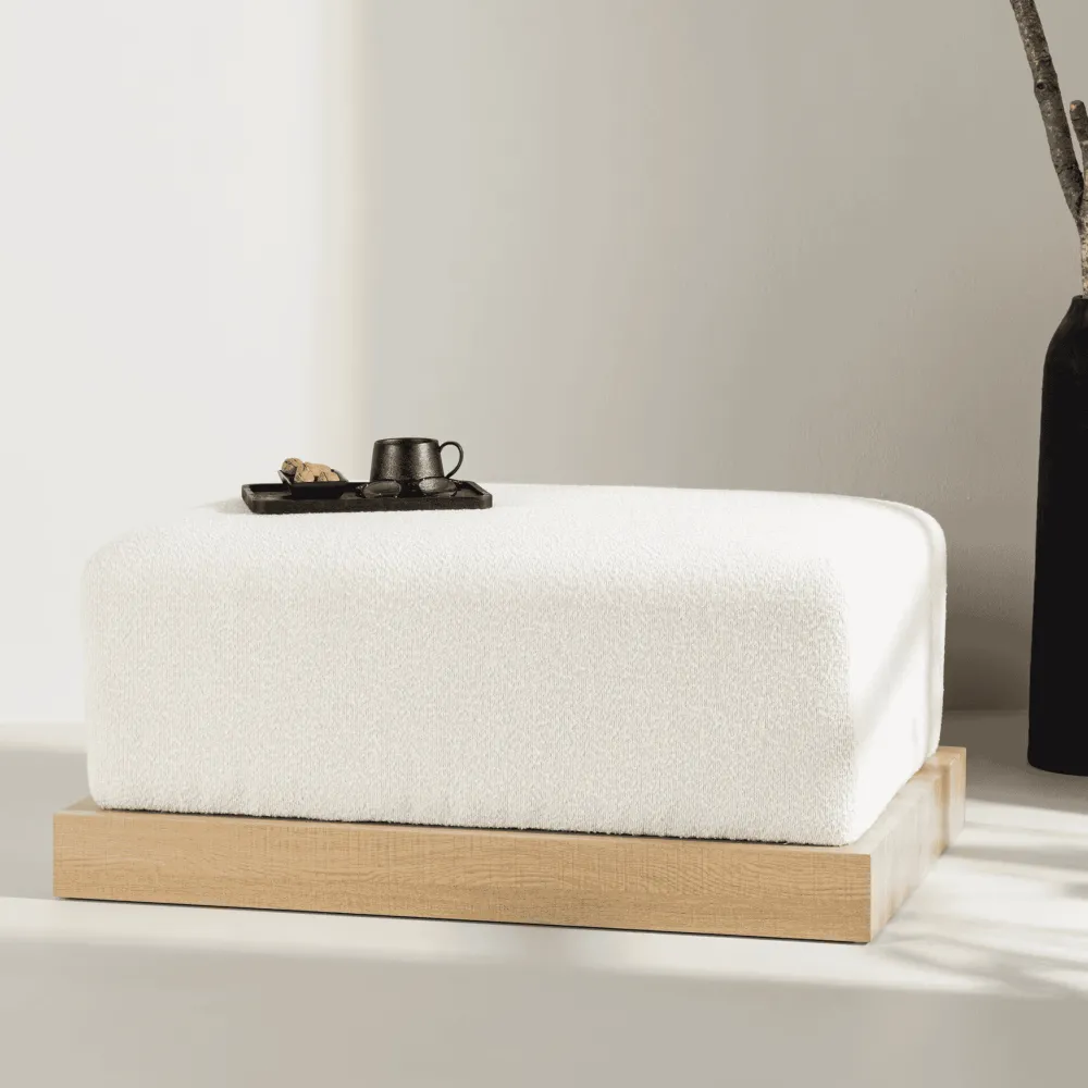 Geef je kamer een moderne lift met onze rechthoekige voetenbank Alaric! Met zijn trendy en functionele ontwerp in witte bouclé stof is deze voetenbank de perfecte manier om je kamer een moderne uitstraling te geven. Het decoratieve MDF houten frame aan de onderkant zorgt niet alleen voor stabiliteit, maar vult ook de rechthoekige vorm op een stijlvolle manier aan. Gebruik hem als extra zitplaats wanneer dat nodig is of als ontspannende poef om je inrichting aan te vullen met een vleugje hedendaagse trends. De rechthoekige vorm maakt hem gemakkelijk te integreren in verschillende ruimtes, terwijl de witte bouclé stof een frisse en moderne uitstraling geeft aan de kamer. Creëer een harmonieuze omgeving met deze praktische en trendy voetenbank die zowel functioneel als stijlvol is. Afmetingen voetenbank: Breedte: 100cm, Diepte: 70cm, Hoogte: 45cm.