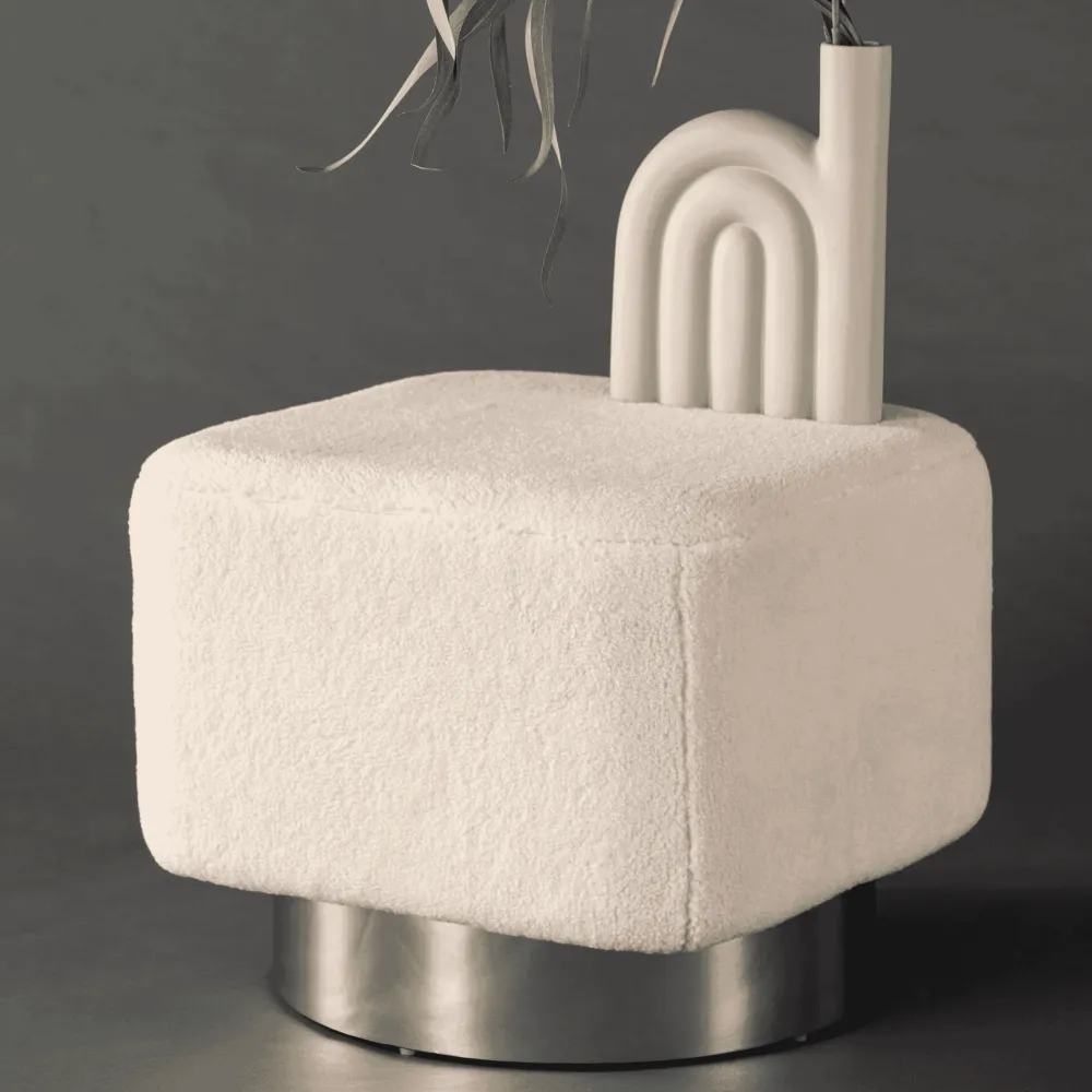 Montey is een mooie offwhite poef gemaakt van het gezellige materiaal fleece. Met zijn zachte en comfortabele oppervlak is hij perfect om op te zitten en te genieten van ontspannende momenten. Het zilverkleurige frame van de poef voegt een unieke touch toe die echt opvalt.