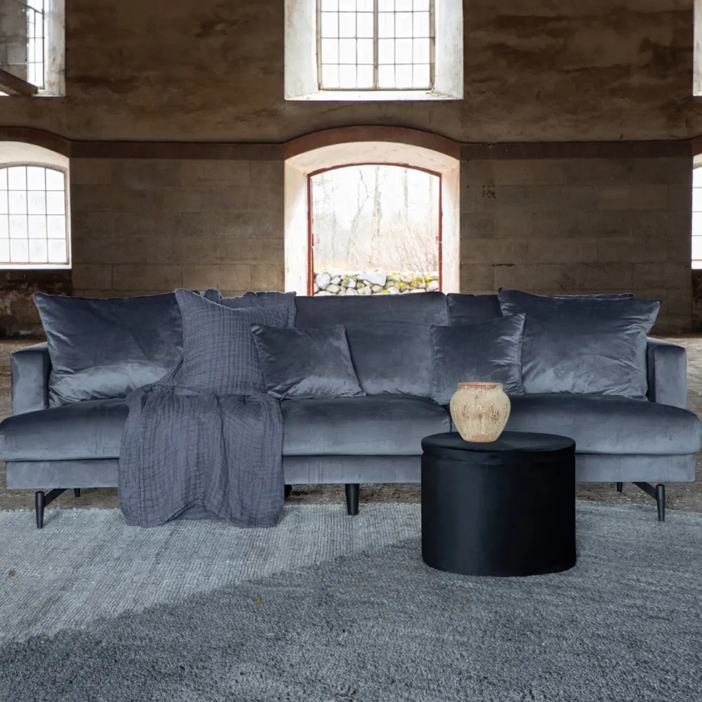 Een donkergrijze, fluwelen droombank die luxe en stijl uitstraalt! De Tamora bankenserie combineert een elegante designtaal, strak Scandinavisch design met een charmante indruk die een uitnodigende blikvanger creëert. De smalle metalen botten geven deze 3-zitsbank een slimme en decoratieve lift waardoor je er gemakkelijk onder kunt stofzuigen. Geef je tijd voor ontspanning – gezellig met het gezin of verspreid je alleen! Afmetingen bank: Breedte: 255 cm, diepte: 56 cm, hoogte: 66 cm.