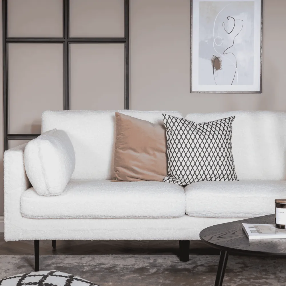 Wat is een bankdroom als het niet deze stijlvolle en moderne 2-3-zits bank in zachte, witte teddy klei is? Onze comfortabele bank uit de serie Tylan Inger geeft je huis een ongelooflijk warm en uitnodigend gevoel en zal de bankmomenten zeker verlengen. Het ontwerp is tijdloos met rechte Scandinavische vormen en smalle metalen poten in zwart.