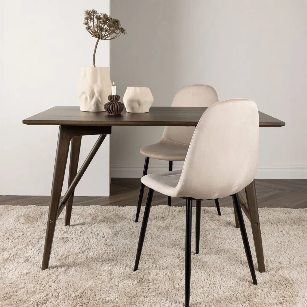 Yolando heeft een moderne walnootkleur die mooi past bij het moderne huis. Het rechthoekige tafelblad heeft een matte afwerking en de poten zijn licht uitlopend met een stabiliserend frame, consequent gemaakt van MDF en rubberhout. Combineer met een paar comfortabele eetkamerstoelen en je hebt een complete eetkamergroep voor in huis!