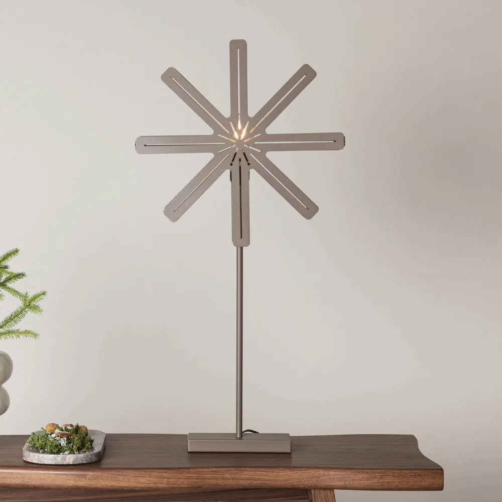 Deze bruine, stervormige tafellamp heeft een slanke lampvoet die hem een elegante en verfijnde uitstraling geeft. De lampenkap lijkt op een ster en verbergt de gloeilamp terwijl hij een royaal en aangenaam licht in de kamer verspreidt. Met Aimie creëer je een ontspannen en gezellige sfeer, of je hem nu op je bureau of in de slaapkamer zet.