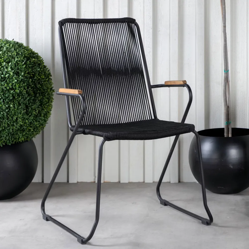 Modern, stijlvol en duurzaam – een trendy stoel die bij iedereen past! Catheryne heeft een comfortabel ontwerp met armleuningen van teakhout en een zwarte zitting van touw. Een meubelstuk dat uitnodigt tot vele gezellige momenten! Geniet extra van heerlijke maaltijden buiten en richt het balkon stijlvol in. De stoel is stapelbaar.