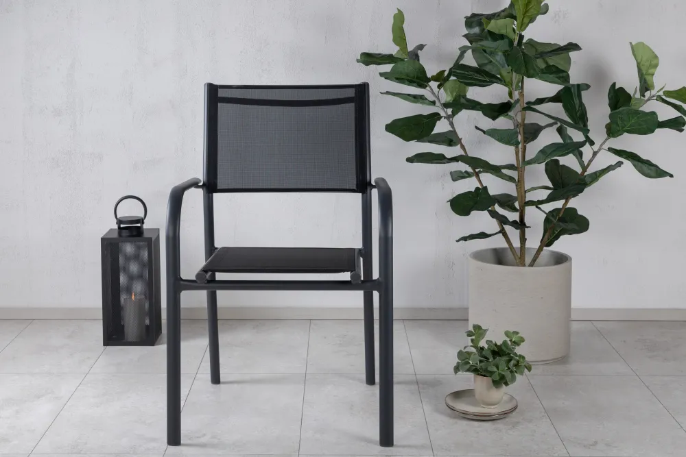 Maak je buitenruimte praktisch met een stijlvolle zwarte eetkamerstoel uit de Vaishali-serie. Deze stoel is gemaakt van aluminium met een zwarte textilene zitting en combineert een modern design met alledaags gemak. Hij is stapelbaar voor eenvoudige opslag, waardoor hij ideaal is voor flexibel buitenleven. Een stevige stoel die je zal vergezellen tijdens vele heerlijke zomerse diners die nog komen gaan!