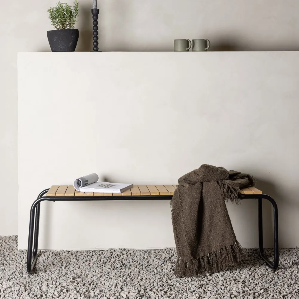 Deze bank uit de Ruy serie heeft alles wat je nodig hebt – stijlvol, duurzaam en slim! De bank heeft een geribbeld werkblad in smaakvol acacia en smalle poten in zwart staal. Het luchtige en minimalistische ontwerp geeft je een praktische en opvallende bank die perfect past op het terras. Plaats hem tegen een zonnige muur en geniet buiten van een heerlijk kopje koffie!