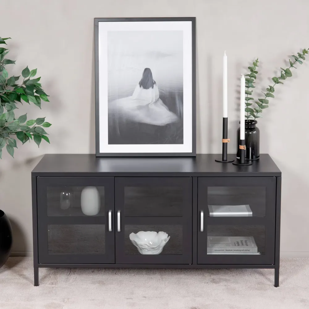 Cerita, van gepoedercoat zwart staal in industrieel ontwerp met drie deuren van helder glas. Frame van gepoedercoat zwart staal, zilveren handgreep en een verwijderbare plank. Afmetingen: Lengte: 80 cm, breedte: 43 cm, hoogte: 97 cm. Lichtere montage vereist.