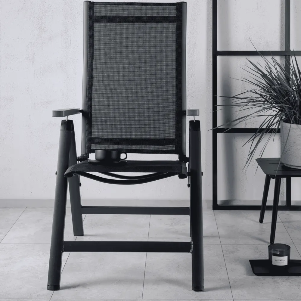 Candise, onze praktische stoel met 5 standen in zwarte kleur met armleuningen voor extra gemak. De stoel doet het net zo goed in de tuin als op het balkon. Geniet op de beste manier van de zomer!