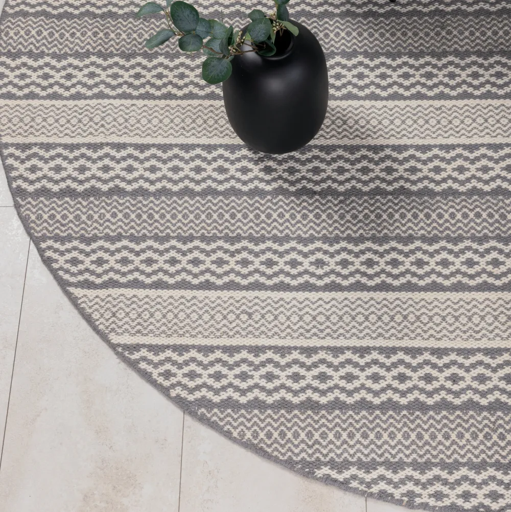 Versier je huis met een vleugje cultuur en een leuk interieurdetail dat een gezellig en modern gevoel in de kamer creëert. Deze prachtige handgeweven wollen mat uit de serie Keoki heeft een decoratief patroon in een lichtgrijze tint. Door de trendy ronde vorm en het indrukwekkende materiaal kan het tapijt in de meeste kamers worden gelegd en zal het zeker de huiselijke sfeer verhogen. Doe jezelf en je huis een plezier en investeer in een duurzame wollen mat die de tijd doorstaat!
