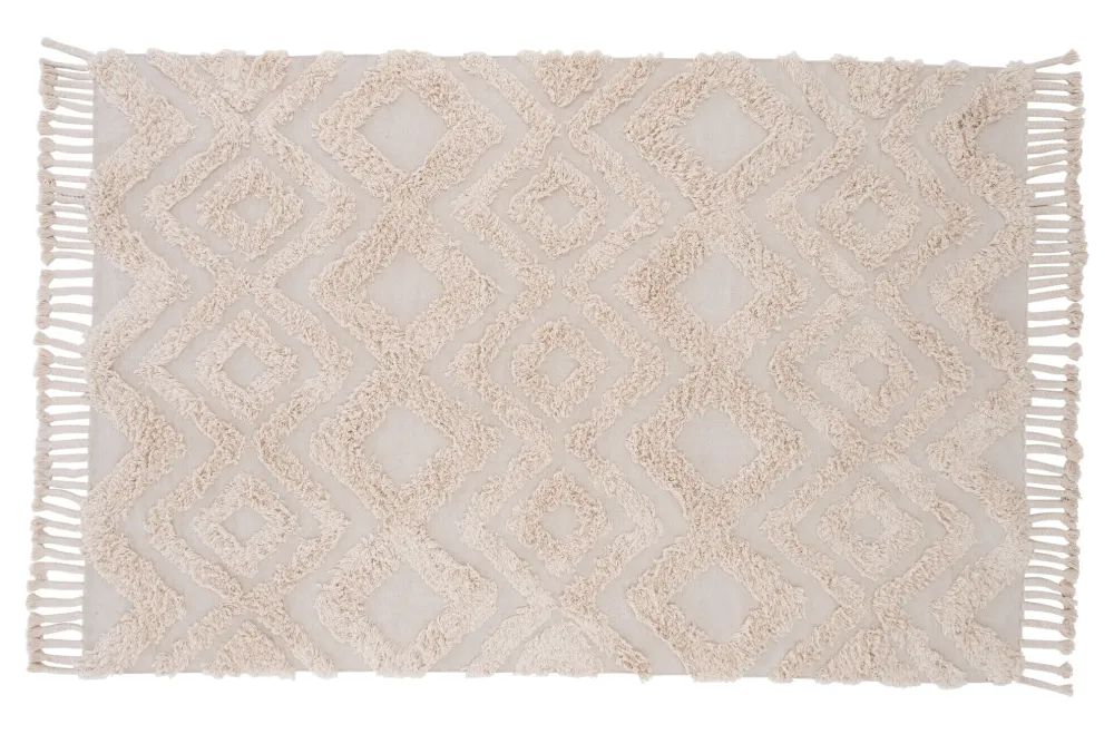 Isidra, een aarden regend katoenen mat in naturel voor. Het tapijt is getuft met zigzags en franjes met de korte kant als voor. Isidra is een trendy rechthoekig r vloerkleed dat het extraatje in je kamer maakt.