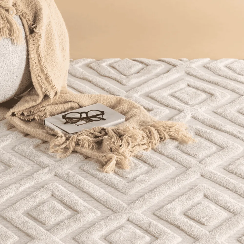 De witte kleur van het tapijt straalt elegantie en frisheid uit en past perfect in moderne interieurstijlen. De korte pool zorgt niet alleen voor een zacht en aangenaam gevoel onder de voeten, maar creëert ook een warme sfeer in de kamer, waardoor het een perfecte plek is om tot rust te komen en te ontspannen.