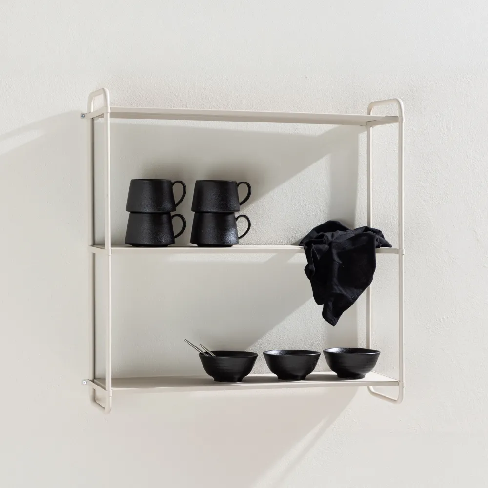 Deze wandplank is gemaakt van beige gepoedercoat ijzer dat naadloos past in verschillende stijlen en huizen. Het klassieke ontwerp gaat nooit uit de mode en geeft je kamer een elegant tintje. Met drie slanke planken en een langwerpig ontwerp biedt Jaymie een stijlvolle ruimte voor je mooie decoraties. Hier kun je alles ordenen, van boeken tot planten en kaarsen. Houd je ruimte georganiseerd en elegant.