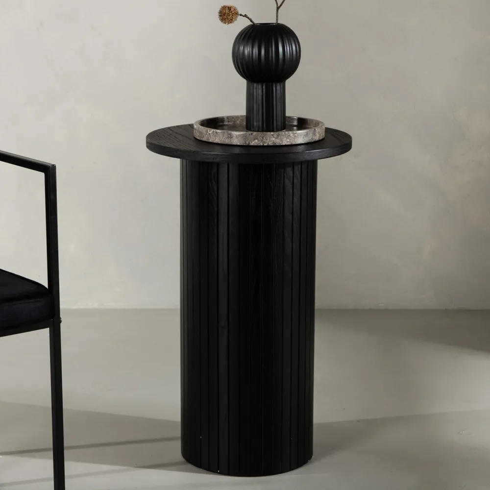 Modern, stijlvol en tijdloos – wat wil je nog meer van een bijzettafel? Deze opvallende bijzettafel uit de Fionna serie behoort tot de Nohr collectie en is consequent gemaakt van MDF met fineer in een roetzwarte afwerking. Het tafelblad is dun in een rond design en de romp is robuust met cilindrische poten in geribbeld design. Het doordachte geheel met zachte Scandinavische vormen creëert een warm en modern gevoel voor de kamer. Gebruik als bijzettafel, reliëfhoek of sokkel – alleen de verbeelding stelt grenzen!