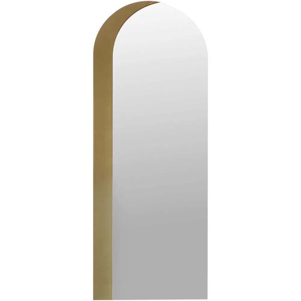 Deze spiegel heeft een afgeronde vorm met een verfijnde omlijsting in een zachte goudtint. De rand oogt gelijkmatig en rustig, wat bijdraagt aan een elegante uitstraling. Door het evenwichtige ontwerp past de spiegel goed binnen zowel moderne als meer klassieke interieurs.