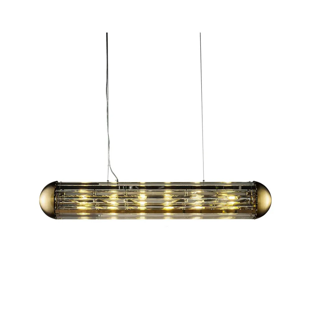 De hanglamp Mula is een stijlvol verlichtingsstuk dat modern design en verfijnde elegantie combineert. De langwerpige vorm, voorzien van heldere glazen panelen, zorgt ervoor dat het licht op een fascinerende manier wordt verspreid, wat een warme en uitnodigende sfeer creëert in elke ruimte. De afwerking van de lamp geeft een luxe uitstraling, waardoor deze lamp niet alleen functioneel is, maar ook als een decoratief kunstwerk kan dienen. “Mula” is ideaal voor gebruik boven een eettafel, in een keuken of in andere ruimtes waar een opvallende, maar toch subtiele verlichtingsoplossing gewenst is.