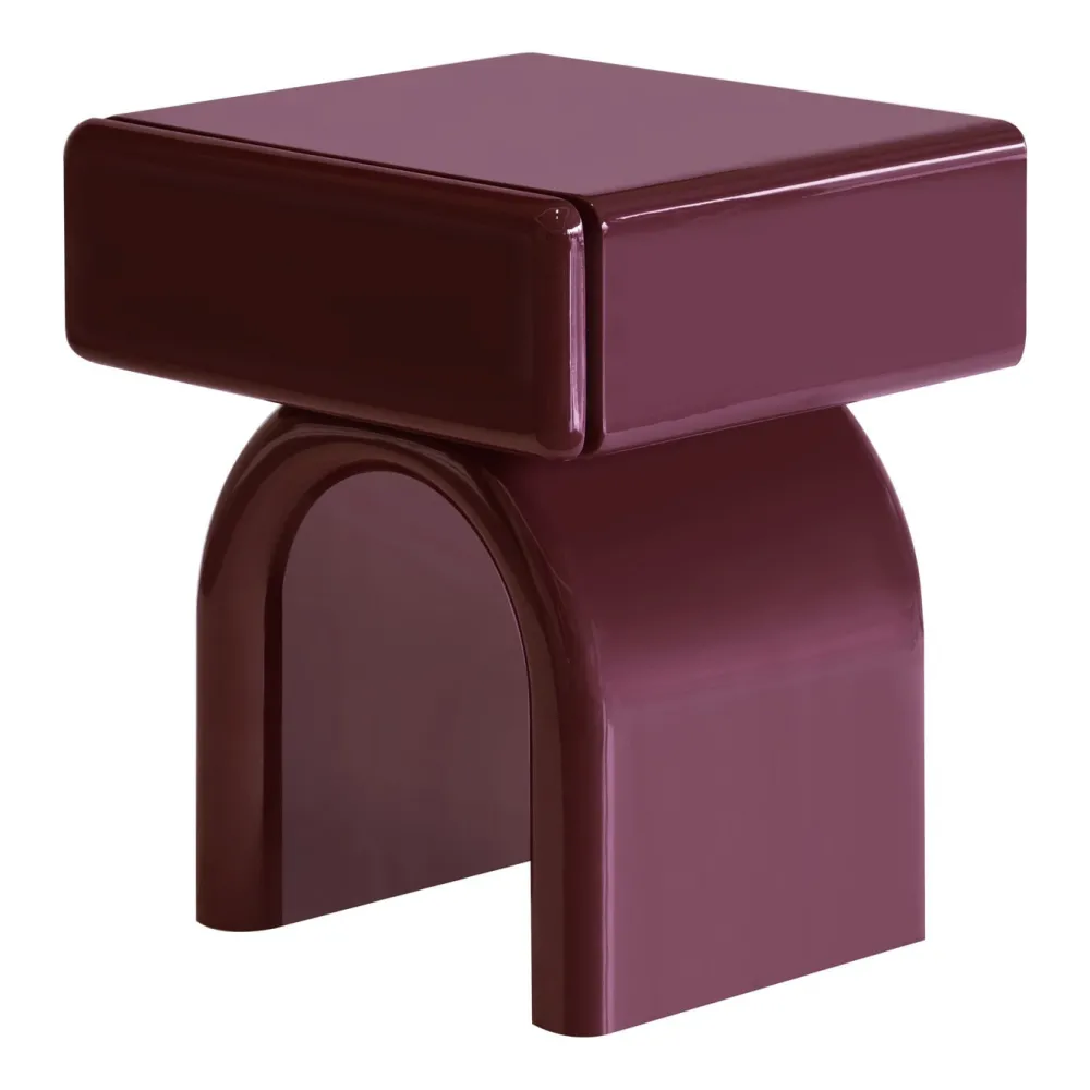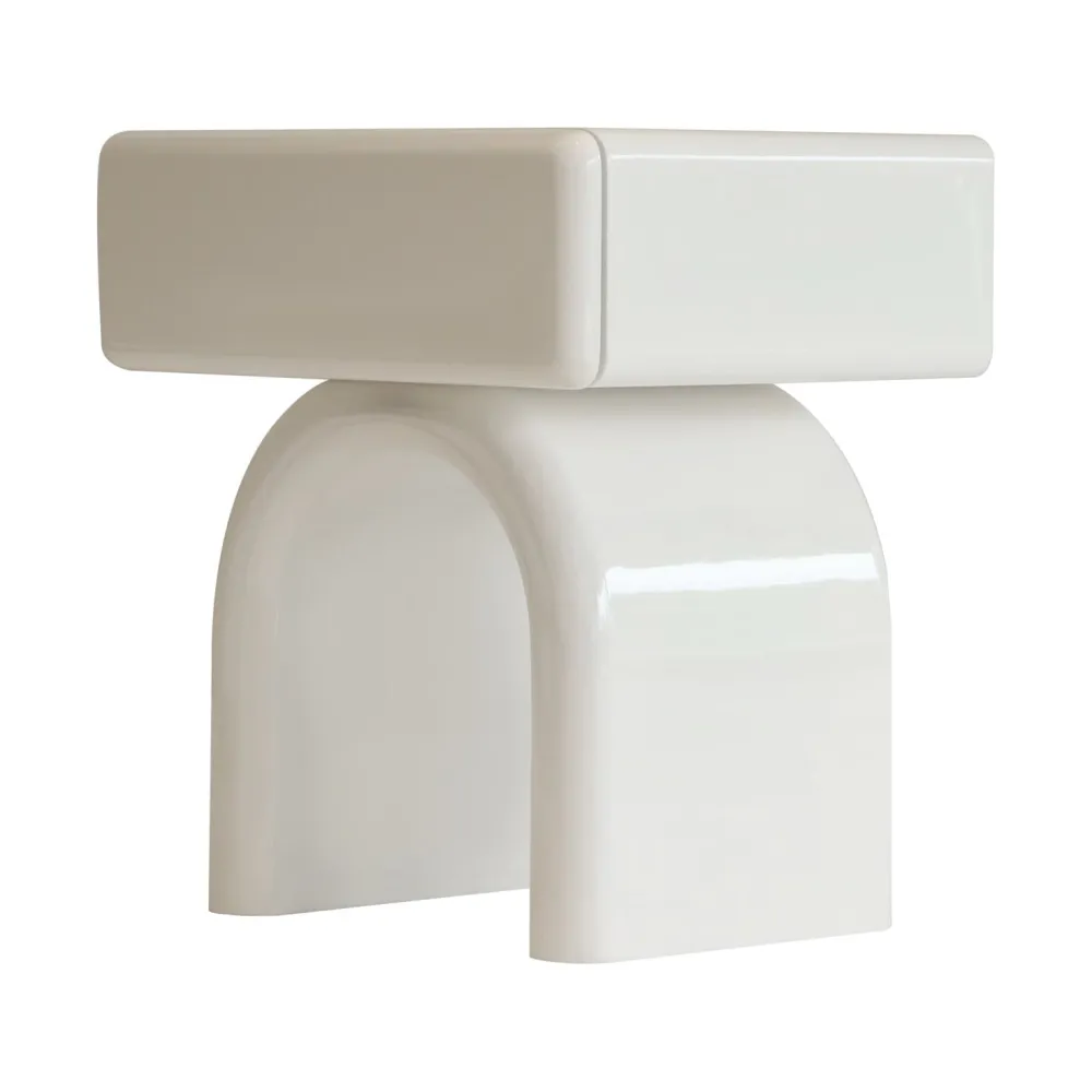 Deze bijzettafel heeft een compacte vorm met rechte lijnen en een gesloten uitstraling. Het ontwerp toont een duidelijk volume met een geïntegreerde lade, wat zorgt voor een rustige visuele indruk. De lichte kleur draagt bij aan een zachte en neutrale uitstraling in het interieur.
