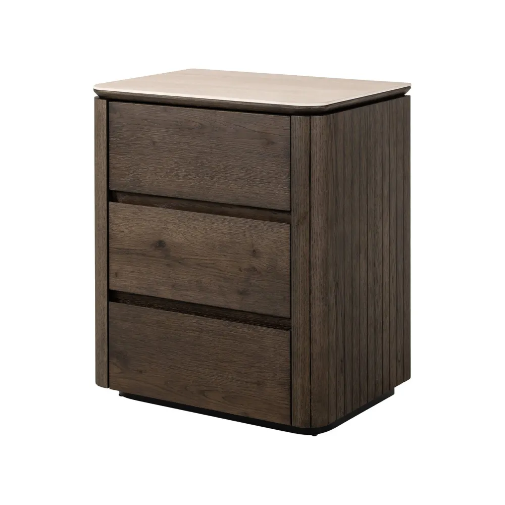 Het nachtkastje Ritz met drie lades combineert tijdloze elegantie met natuurlijke materialen, dankzij het travertin keramische blad en het lichaam van eikenfineer. De warme houtstructuur en het luxe blad zorgen voor een chique uitstraling, terwijl de drie ruime lades praktische opbergruimte bieden. Perfect voor een stijlvol ingerichte slaapkamer met een natuurlijke touch.