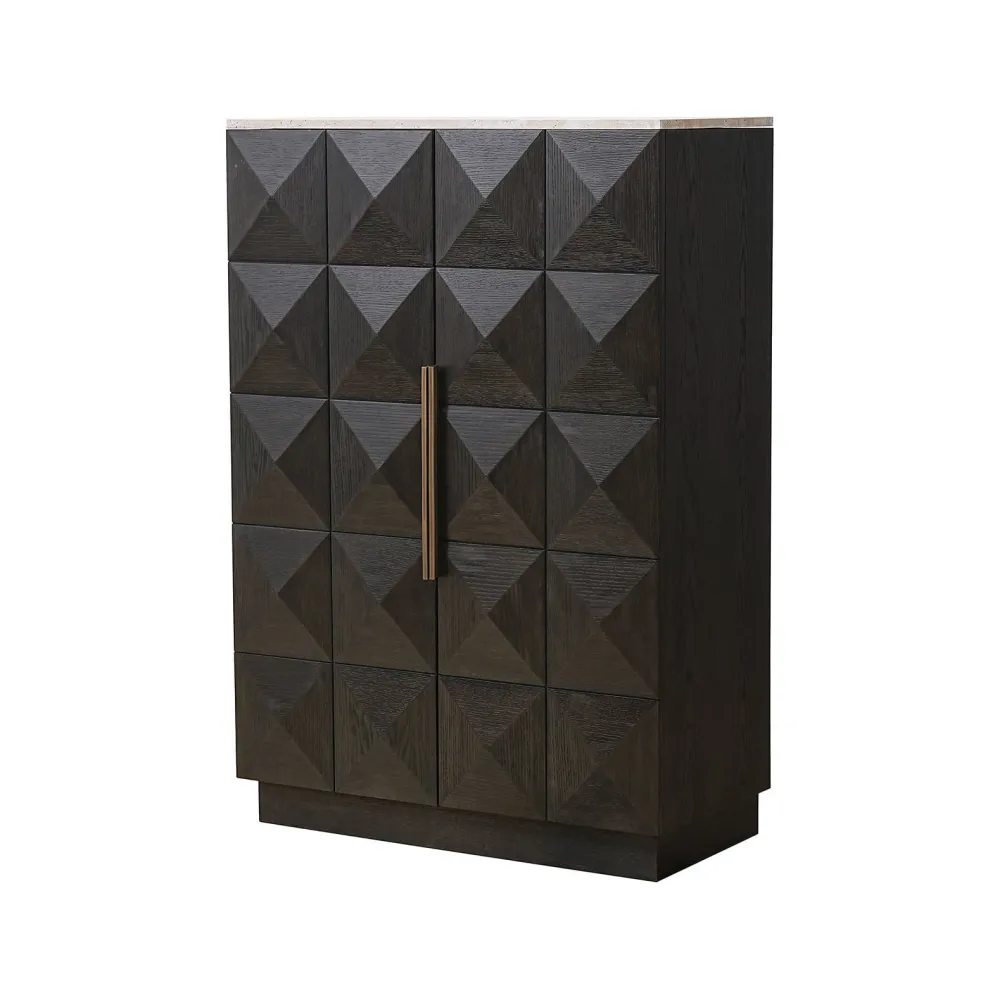 De Claremont wandkast is vervaardigd uit eikenfineer, eikenhout, travertine en hout, wat zorgt voor een robuuste en elegante uitstraling. De kast heeft twee deuren met een opvallend geometrisch patroon, wat een moderne en stijlvolle touch aan het ontwerp geeft. Het bovenblad van steen voegt een luxueus element toe, terwijl de solide constructie duurzaamheid garandeert. Deze wandkast biedt ruime opbergmogelijkheden en is een functioneel en esthetisch aantrekkelijk meubelstuk voor verschillende interieurstijlen.
