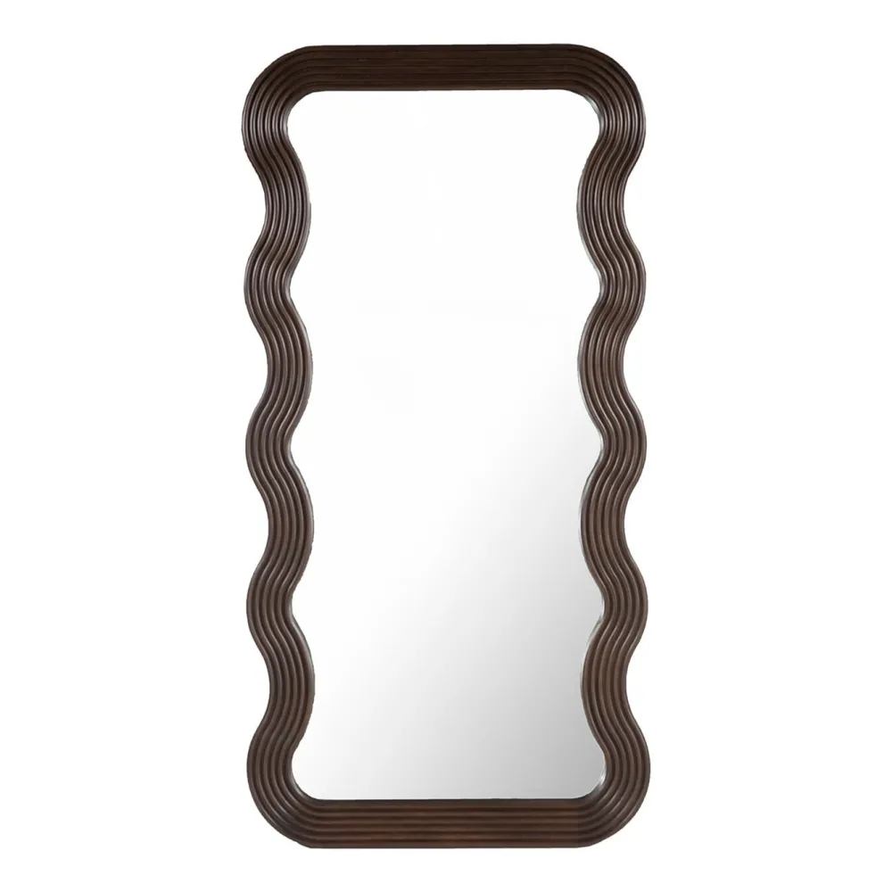 Spiegel ‘Mayfield’ van Richmond Interiors is een indrukwekkende organisch gevormde spiegel met een sierlijke, golfvormige rand van mangohout. De houten omlijsting is voorzien van een ribbelpatroon, wat diepte en textuur toevoegt aan het natuurlijke materiaal. Met een hoogte van 170 centimeter biedt Mayfield een volledig beeld, ideaal om jezelf van top tot teen te bekijken.