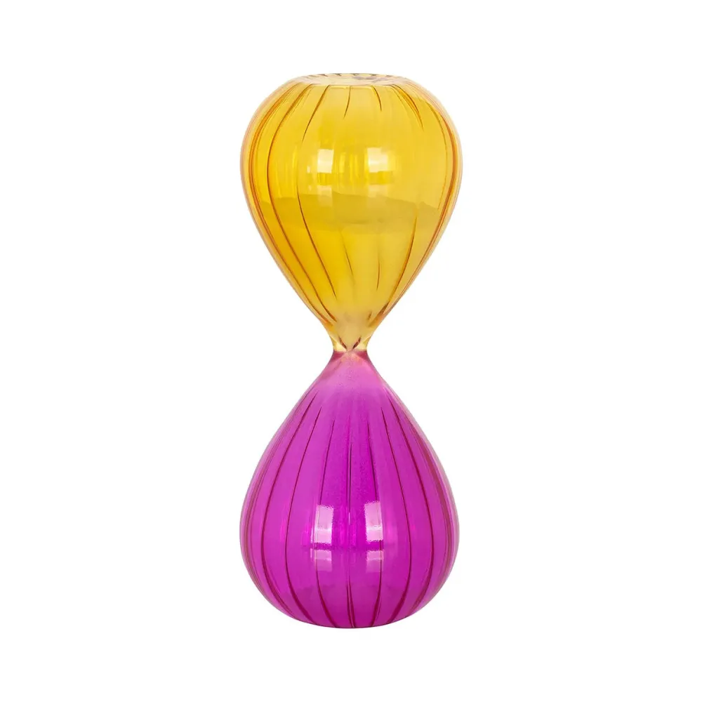 De zandloper Jahla heeft een glazen constructie met tinten van paars en geel. Het zand binnenin is neutraal, terwijl het gekleurde glas zorgt voor een subtiele weergave van tijd die verstrijkt. Het is een bescheiden en tegelijkertijd esthetisch object, geschikt voor diverse interieurs.