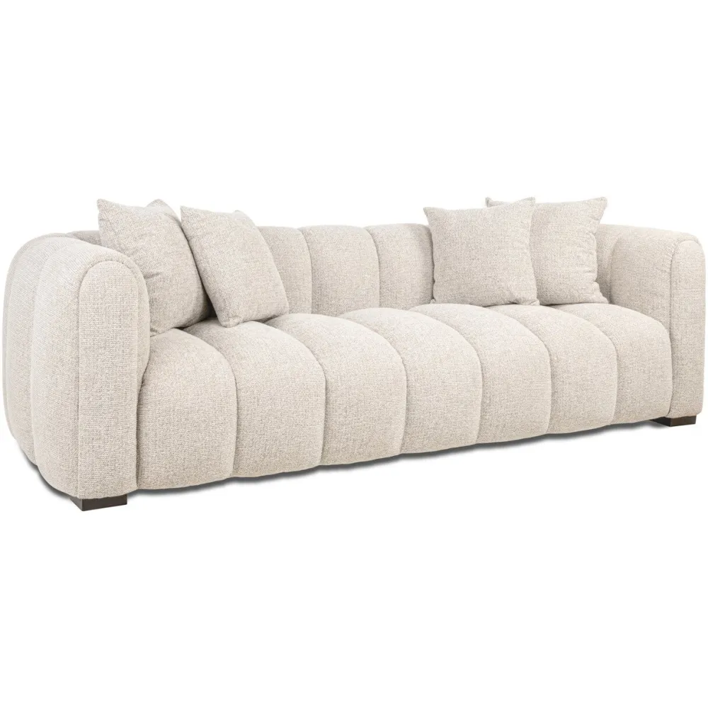 Deze sofa heeft een rechte, ruime vorm met een evenwichtige en rustige uitstraling. De zitting en rugleuning ogen breed en comfortabel, met zachte lijnen die zorgen voor een ingetogen belijning. De bekleding toont een lichte, natuurlijke kleurindruk met een matte textuur. Door het uitgebalanceerde ontwerp past de sofa goed binnen moderne en serene woonruimtes.