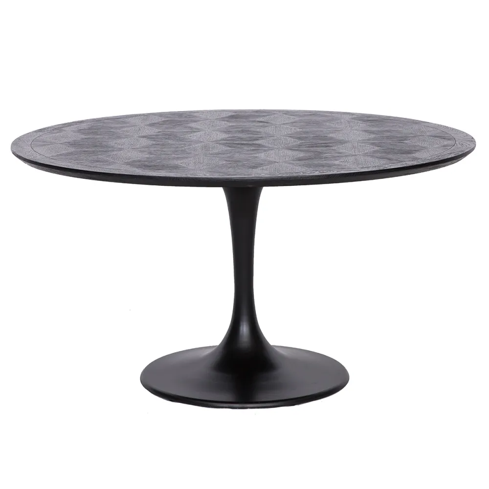 Eettafel Blax rond Ø140 cm is krachtig, speels en mysterieus. De zwarte, ronde tafel straalt elegantie uit met een knus gevoel. Breng contrast in je interieur met onze Blax collectie, gemaakt van zwart eiken en staal.