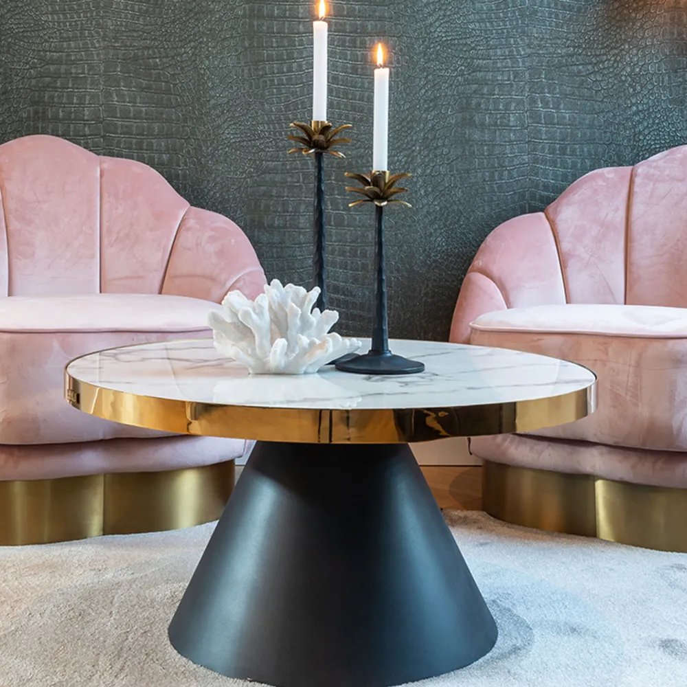 Salontafel Odin rond Ø80 is een verfijnd ontwerp met een top van faux marmer, goudkleurige rand en een zwarte, kegelvormige basis van RVS. Deze salontafel geeft een elegante touch aan elke ruimte!