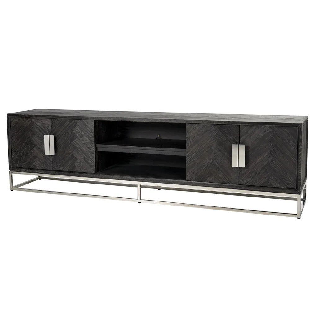 TV-dressoir 220 Blackbone silver 4-deuren is gemaakt van eiken en RVS. Het zwarte TV-dressoir uit de Blackbone collectie geeft je interieur een elegante, maar toch ook stoere touch.