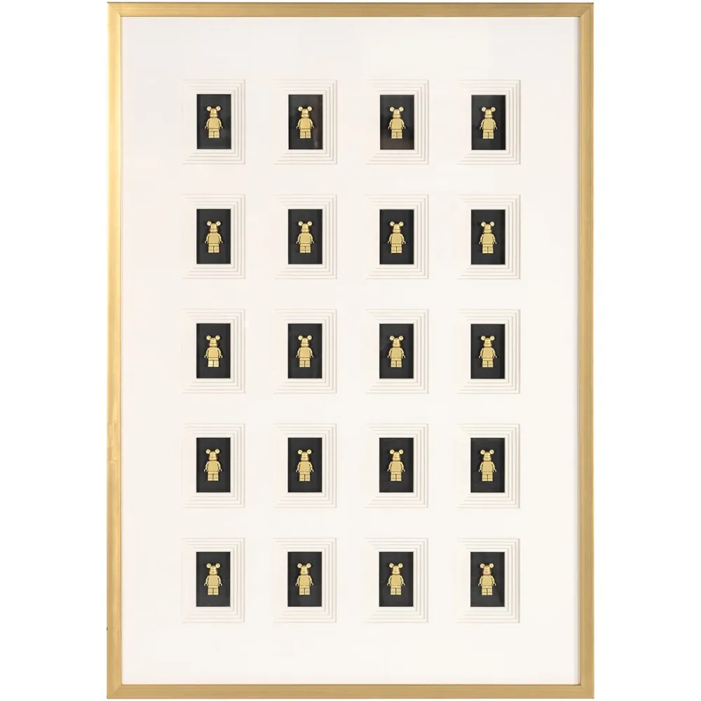 Wall art Bear block 3D is een verfijnd en modern kunstwerk dat een strakke, minimalistische compositie biedt met een opvallend driedimensionaal effect. De herhaling van gouden blokvormen op een strakke witte achtergrond creëert een harmonieus patroon dat rust en symmetrie uitstraalt. De combinatie van zwart, wit en goud geeft het werk een tijdloze en luxe uitstraling, waardoor het een subtiel, maar krachtig statement maakt in elke ruimte. Of je het nu plaatst in een woonkamer, hal of kantoor, Wall art Block 3D voegt een vleugje moderne elegantie toe aan je interieur en trekt de aandacht met zijn intrigerende, gestructureerde details.