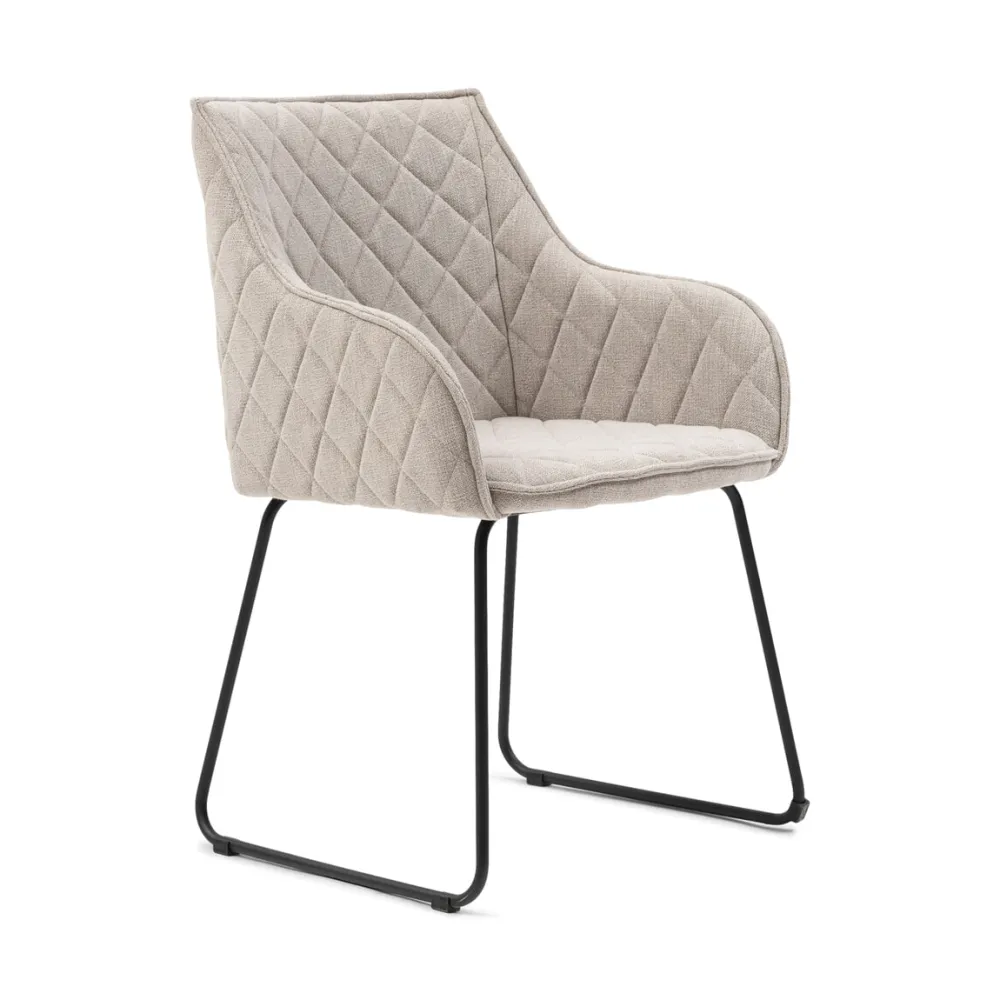 Een eetkamerstoel in industriële stijl, mede dankzij de metalen sledepoten. Zit heerlijk en voelt heerlijk, want de mouliné linnen bekleding in fabulous flax is prachtig doorgestikt in hele kleine vierkante kussentjes, lijkt het wel. Past in ieders interieur.