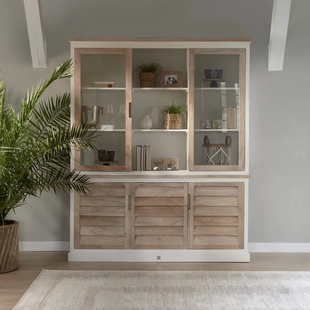 Wat een compleet meubel is dit. Flink uit de kluiten gewassen, dus er kan veel in zonder dat de kast uitpuilt. Twee grote glazen deuren met daarachter drie flinke planken, over de hele breedte van 124 cm. Daaronder jaloeziedeurtjes met nog eens twee planken. En twee lades, mooi verstopt maar wel degelijk bij de hand. De kast, die 210 cm hoog is, is gemaakt van mangohout. Mooi blank gehouden, samen met de witte planken een juweeltje in huis.