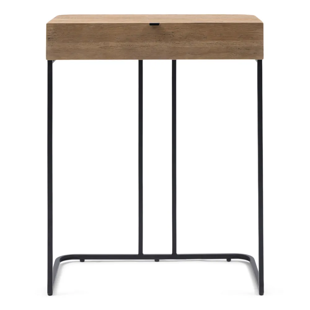 - Dit bureau heeft een stalen onderstel en een houten blad met prachtige nerven. Het ontwerp combineert robuuste industriële elementen met natuurlijke schoonheid. Met een lade voor voldoende opbergruimte biedt het bureau zowel functionaliteit als esthetiek, ideaal voor een stijlvolle en georganiseerde werkruimte.