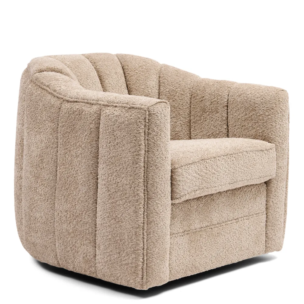 Ervaar het ultieme comfort en stijl met deze luxe fauteuil. De subtiele ronde rug en de zachte manhattan weave stof in Soft Walnut zorgen voor een verfijnde uitstraling, terwijl de draaifunctie je de vrijheid geeft om je in alle richtingen te bewegen. De comfortabele armsteunen nodigen uit tot ontspanning, waardoor deze stoel niet alleen een eyecatcher is, maar ook een plek om echt tot rust te komen. Perfect voor een chique zithoek of werkruimte.