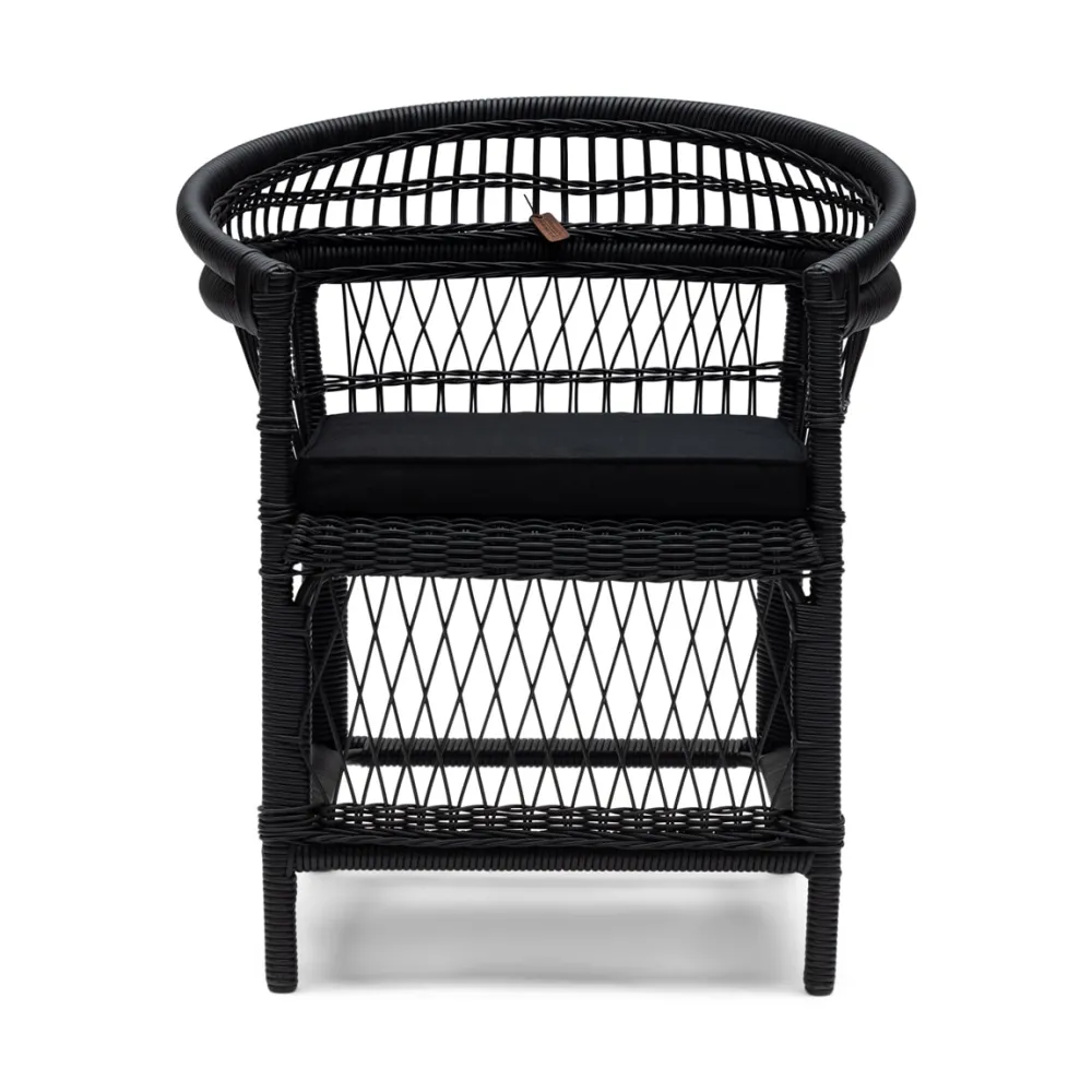 Elegante stoel voor in de tuin, op het terras of het balkon. Gemaakt van weerbestendig wicker om een aluminium frame gewikkeld. Het kussen in de stoel heeft een katoenen omtrek. De stoel is erg stevig, dankzij vier extra spijlen onder aan de poten.