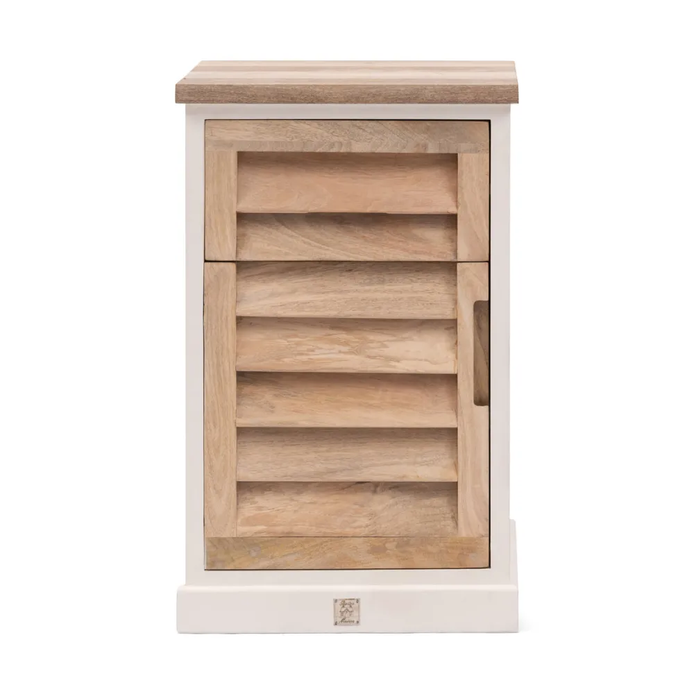 De Pacifica-serie heeft nu ook meubelen voor in de slaapkamer, zoals dit nachtkastje. Het kastje is gemaakt van mangohout in een naturel kleur met een witte coating. De voorkant heeft een shutter-look, hierin zit een deurtje en een onzichtbare lade verborgen. Verkrijgbaar in een linker- en een rechtervariant.