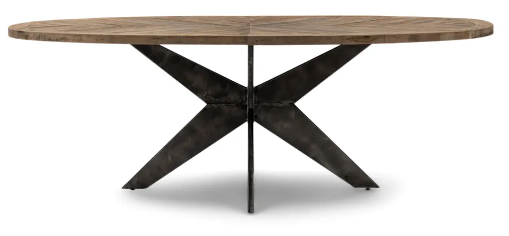 Een eettafel die stoer en klassiek combineert? Dan heb je het over de Falcon Crest-serie. Deze eettafels hebben namelijk een blad van stoer, ingelegd oud eikenhout, met een gekruist patroon Het onderstel is van matzwart metaal, waarin de kruisvorm terugkomt. De vorm van het tafelblad is ovaal.