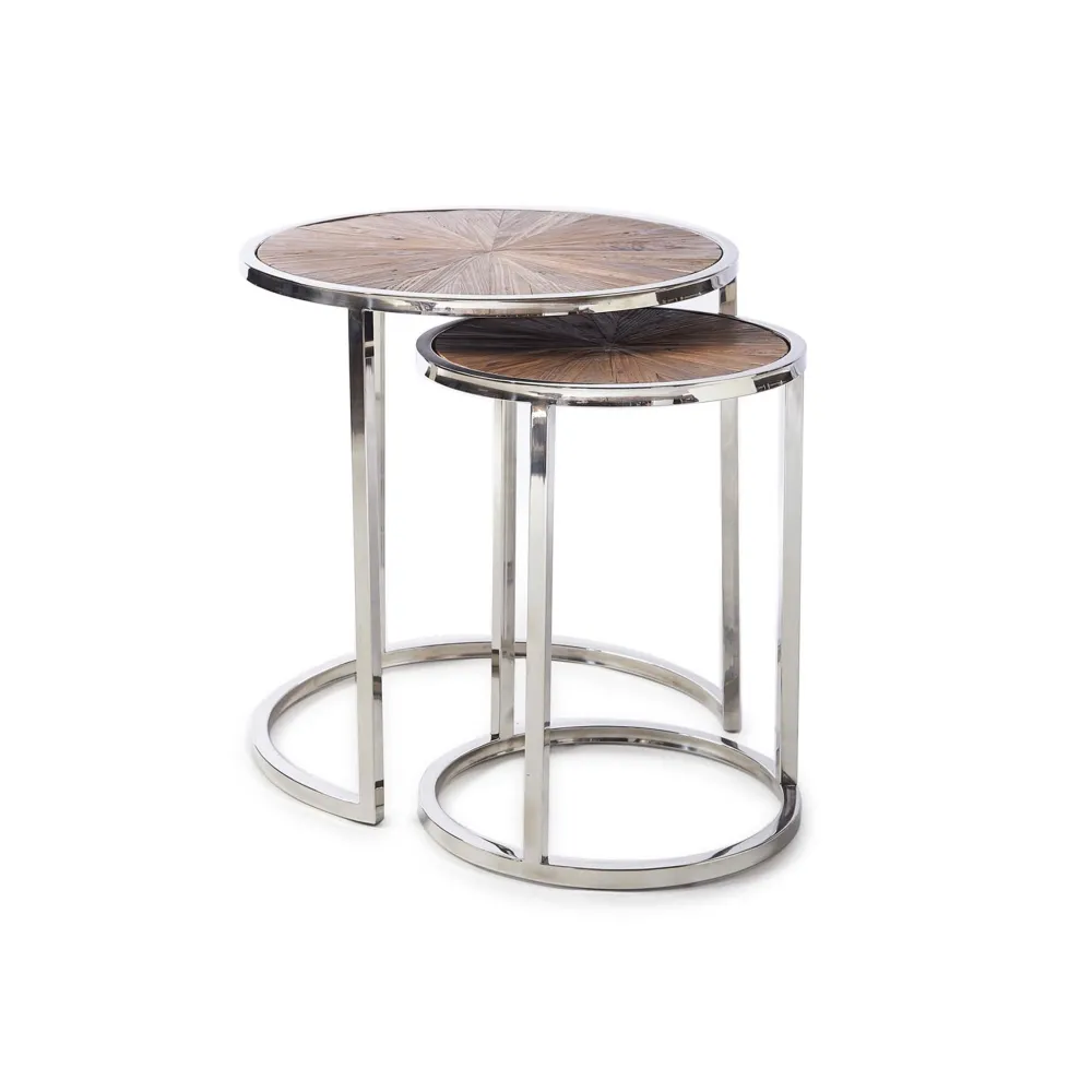 Deze mooie set bijzettafels is gemaakt van gerecycled hout wat een stoer en oude look geeft. Samen met het glanzende rvs zijn de tafels eigentijds, duurzaam en charmant. De diameter van het bovenste tafelblad is 55 cm, de kleinere tafel heeft een diameter van 40 cm.