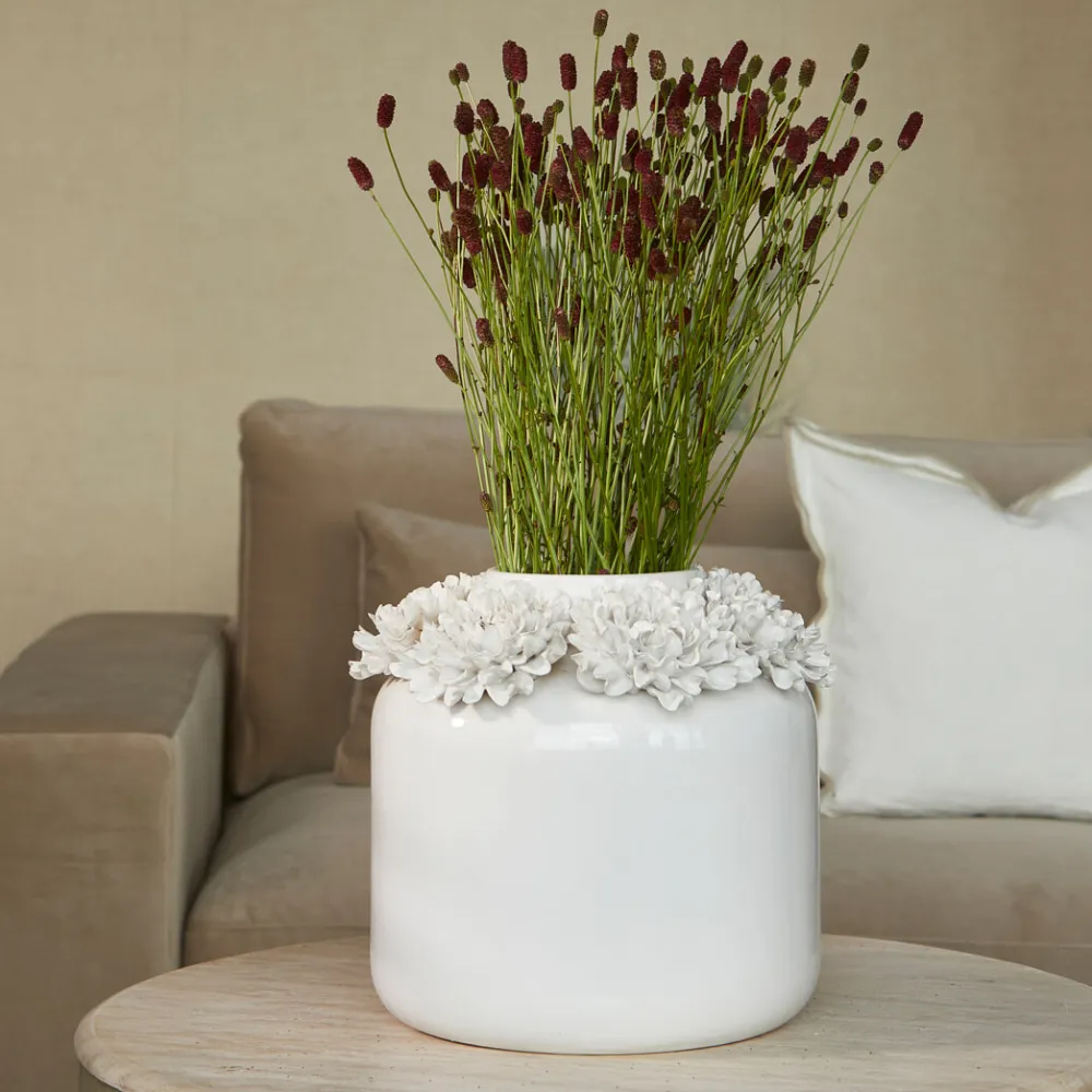 Voeg een verfijnde en elegante touch toe aan je interieur met de Flourishing vaas. Deze prachtige vaas is een kunstwerk op zich. De rand van de vaas is bedekt met handgemaakte keramische bloemen die het gehele oppervlak sieren en zorgen voor een unieke uitstraling. Met een hoogte van 35 cm en een diameter van 36 cm biedt de vaas ruimte voor je mooiste bloemen en creëert het een warme, sfeervolle ambiance in je woning. *Dit item is met de hand gemaakt en fragiel, waardoor extra zorg nodig is bij verzending. Hier zijn extra kosten aan verbonden, bij bestellingen vanaf €500 is verzending gratis bij accessoires.